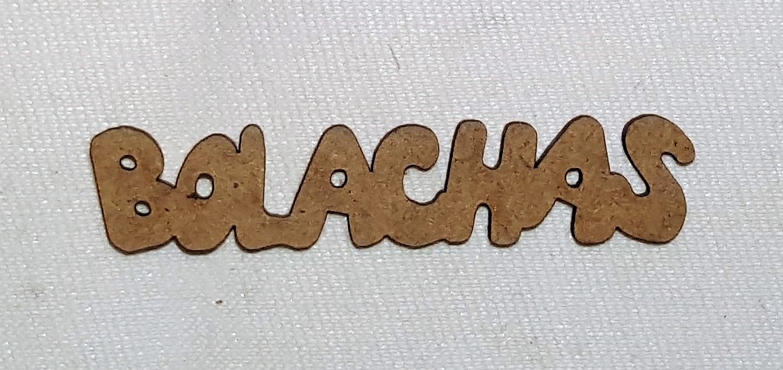 Palavra em madeira cortada a laser 'BOLACHAS' com buracos sobre tecido branco