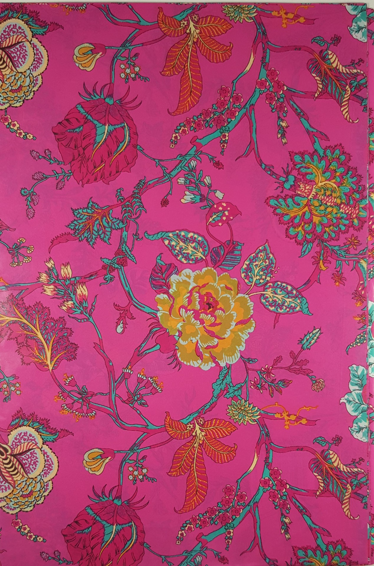 • Tecido rosa com padrão floral colorido e ramos finos